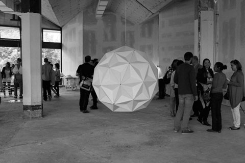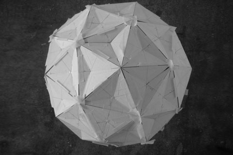 image (top): 16 frequency alternate spheres computer graphics from program by Joe Clinton from Domebook 2 (Bolinas: Pacific Domes, 1971)